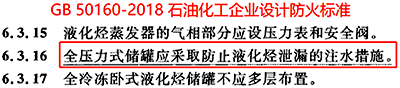 此后,關(guān)于全壓力式儲罐應設置注水系統(tǒng)的強制規(guī)定,一直被標準延續(xù)到今天,甚至將其作為一個重大隱患而提出,可見其備受重視的程度。