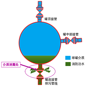其次,球罐的介質(zhì)密度不能比水大,換句話說,注入球罐內(nèi)的水必須要流入到球罐最底部,只有這樣才能將介質(zhì)從泄漏處頂開,用水來代替介質(zhì)從泄漏點泄漏出去,從而將介質(zhì)牢牢限制在容器內(nèi)。