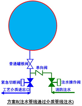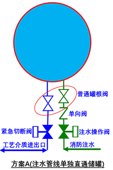 方案A:注水管線采用獨立的一根管線,直接和儲罐連接,管線上設置罐根閥+單向閥+注水操作閥(可遠程操作),其中罐根閥常開,注水操作閥常關(guān)。方案A的優(yōu)勢在于注水線不受工藝介質(zhì)管線的影響,注的消防水能直接通到罐內(nèi),并且注水線的管道尺寸和壓力等級可以單獨設計,注水量能得到保證。方案A的劣勢在于,在球罐上多了一個開孔,并且相連接的管線閥門法蘭都成了潛在的泄漏源。