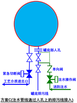 方案C:注水管線通過接入罐底部人孔蓋上的排污管線實現(xiàn)注水。該方案在很多企業(yè)里確實存在,方案C的優(yōu)勢在于,既避免了罐壁上開孔,也不受工藝介質(zhì)管線狀態(tài)的干擾。看起來相對比較完美,但是這種方案的劣勢在于人孔蓋上的排污管線,一般和切水管線都是同一根管線,所以管道的尺寸一般不會太大,常見的DN50-DN80之間,注水量很可能是不滿足的,所以采用方案C,前提是必須注水量計算通過,否則無法適用。