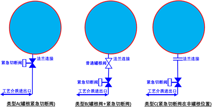 其次,既然在儲罐本體上新開注水口不太現(xiàn)實,那么采用已有的管線也就成了在役球罐注水改造的現(xiàn)實選擇。這個現(xiàn)實選擇很多企業(yè)是不盡相同的,因為每家企業(yè)的球罐工藝進出口管道是不太一樣的,這里面影響最大的一個區(qū)別就是球罐進出口管道上罐根閥和緊急切斷閥的布置問題。根據(jù)布置狀況的不同,我把在役裝置的球罐按照工藝管道進出口閥門的不同配置,按圖分為A、B、C三種類型,如下圖: