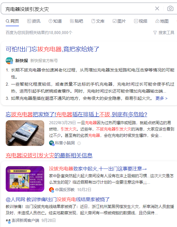 其次存在火災風險。這種案例已經發生多起,尤其網上購買的劣質充電器,火災風險更大。不能掉以輕心。據光明網報道,今年9月,杭州某小區居民因充電器沒拔引發火災,所幸沒有造成人員傷亡。