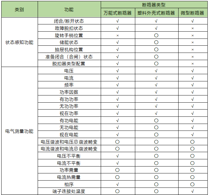 表中智能斷路器的“遠程復位”功能需謹慎!當過負荷或短路跳閘后不建議遠程復位,需人工現場排查故障后手動復位;萬能式斷路器的“電壓和電流不平衡”功能不需增加成本即可實現,故作為基本功能。