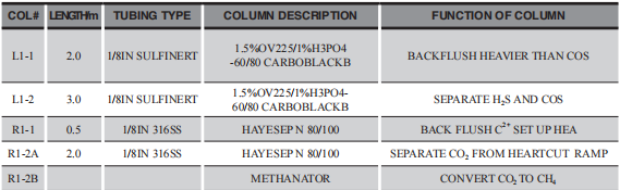 從表1和表2的配置圖中可以看出分離H2S和COS的色譜柱都經過鈍化處理(硅鋼管),分離CO2的色譜柱選的是316不銹鋼管,里面根據需要分離的組份放入不同的填充物(填料)。分離總硫的色譜柱中填充 1.5%OV225(高惰性交聯)和1.0%的磷酸,所以新鄉公司與新疆公司分離總硫的毛細管色譜柱長度一樣。分離CO2的色譜柱新鄉和新疆公司都是采用的安捷倫色譜柱,新鄉使用的固定相填充物為HAYESEP N型的新疆為HAYESEPQ型,所以長度不一樣,從長度來看新鄉項目的分離效果較好。