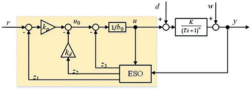 上述被控對(duì)象模型代表了工業(yè)過(guò)程中一大類自平衡對(duì)象,雖然忽略了被控對(duì)象可能具有的震蕩特性、非最小相位特性,但由于ADRC的特點(diǎn),可以將未精確建模的信息通過(guò)總和擾動(dòng)進(jìn)行估計(jì)抵消。實(shí)際上以此高階模型作為被控對(duì)象推導(dǎo)出的參數(shù)整定公式可以適用于更大范圍。