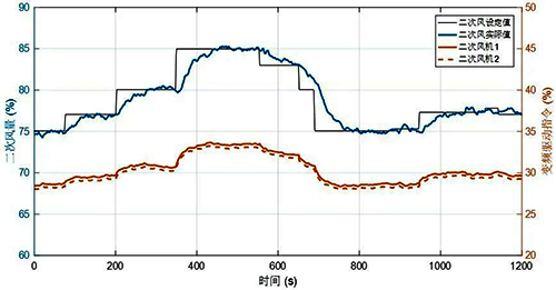 ADRC參數(shù)整定公式首先在多個(gè)仿真算例進(jìn)行了驗(yàn)證,包括延遲對(duì)象、非最小相位對(duì)象、震蕩環(huán)節(jié)的對(duì)象,甚至是100階的高階對(duì)象。之后被用于水箱水位控制的實(shí)驗(yàn)中,最終被應(yīng)用于實(shí)際運(yùn)行的火電機(jī)組中,包括二次風(fēng)、過(guò)熱汽溫等回路。圖3、圖4所示為循環(huán)流化床機(jī)組二次風(fēng)回路的應(yīng)用效果,表中為應(yīng)用指標(biāo)對(duì)比。實(shí)際使用該整定公式非常容易,初次計(jì)算的ADRC參數(shù)就可以保證投切后系統(tǒng)穩(wěn)定過(guò)渡,無(wú)震蕩發(fā)散,并且效果比PID的控制效果好很多。