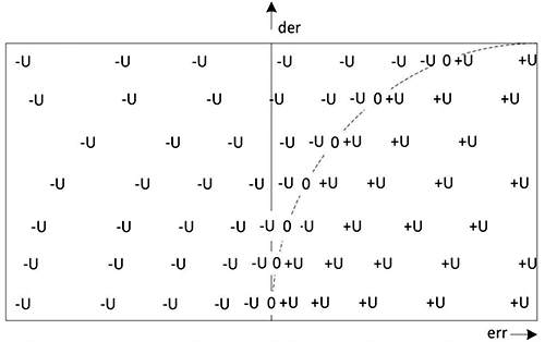 圖7展示了一個輸出值表,可用于訓練ANN控制器。在捕獲開關曲線點之后,需要離線訓練ANN控制器,即不直接在物理控制系統實體上進行訓練。從捕獲的坐標序列的底部(或頂部)開始,對于每個單獨的der輸入,您需要生成多個err值(從-max到+max),并向[err,der]坐標的每個組合提供(到ANN輸出)特定的輸出值。開關曲線的所有輸出值對應負的最大驅動值;開關曲線右側的所有輸出值對應為正的最大值。誤差坐標離開關曲線越遠,需要提供的±U值就越少,因為輸出曲線保持平坦。