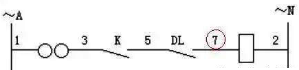 ③對調(diào)控制回路的電源極性,即相線換成零線,零線換成相線。按一般設(shè)計習(xí)慣,圖紙左邊的控制電源為相線,右邊為零線,而繼電器一般靠近右邊控制電源線布置,即一般繼電器的線圈直接接到零線,如下圖所示。按此接線,當(dāng)DL接點距離繼電器很遠(yuǎn)時,電纜7感應(yīng)的電壓很高,就可影響繼電器的返回。對調(diào)相線和零線后,繼電器線圈兩端等電位,則可消除感應(yīng)電壓對繼電器返回的影響。