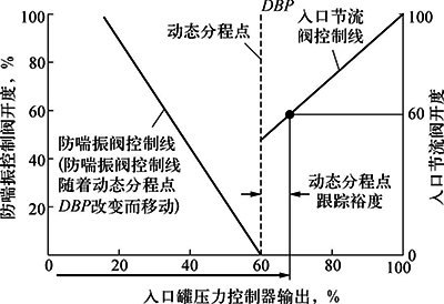 解耦控制器即可以實現壓縮機的性能控制又可進行防喘振控制,并且使性能控制和防喘振控制不能同時進行。壓縮機解耦控制原理如圖5所示,解耦控制器實質就是動態分程控制。動態分程控制的主控變量為壓縮機入口罐壓力,利用壓縮機入口罐壓力控制器的輸出調整入口節流閥和防喘振閥開度,既使得壓縮機入口罐壓力既滿足性能控制要求,又避免了壓縮機產生喘振。將壓力控制器控制入口節流閥開度切換到控制防喘振控制閥開度的切換點稱為動態分程點(DBP)。當壓縮機正常運行時,動態分程點跟蹤壓力控制器輸出,并保持低于壓力控制器輸出一個給定的裕度,