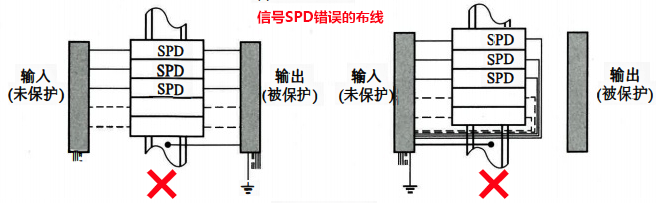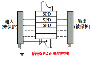 信號(hào)浪涌保護(hù)器的接地線與被保護(hù)設(shè)備的外殼接地端之間需用跨接線連接,并在SPD接地點(diǎn)處連接到大地。非本安信號(hào)SPD在機(jī)柜內(nèi)的布線如下圖所示。