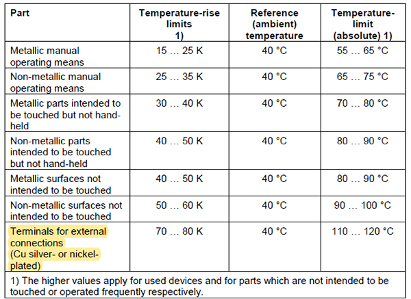 首先,從產(chǎn)品國家標(biāo)準(zhǔn)層面,GB/T14048.1以及IEC60947-1已經(jīng)很明確的告訴我們,低壓電器的端子溫升,裸銅端子允許的溫升極限是60K,鍍錫端子允許的溫升極限是65K,鍍銀端子允許的溫升極限是70K。