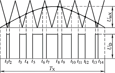 變頻器在進(jìn)行正弦脈寬調(diào)制時(shí),各脈沖的上升沿與下降沿時(shí)刻是由正弦波和等邊三角波的交點(diǎn)來(lái)決定的。如下圖: