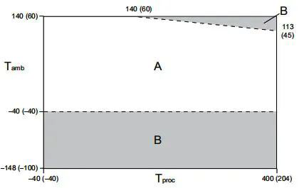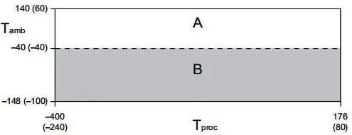 在所有情況下,艾默生質量流量計電子部件不能在環境溫度低于-40°C或者高于60°C的環境溫度下使用。艾默生質量流量計傳感器可以在如下溫度限制圖表所示的過程和環境溫度范圍內使用,如果過程條件接近灰色區域,請咨詢艾默生公司。