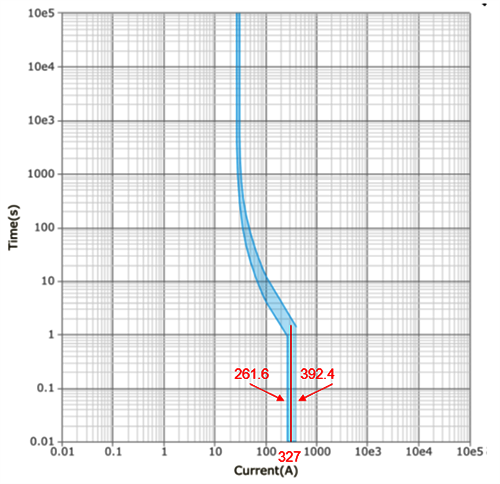 前面提到GV2ME22C電動機保護斷路器的磁脫扣電流值為327A±20%,如下圖所示,當電流低于261.6A(327×0.8)時磁脫扣一定不動作,當電流大于392.4A(327×1.2)時磁脫扣一定動作,當電流介于261.6A與392.4A之間時,磁保護有可能動作,有可能不動作。