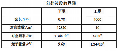 如用電子伏特eV作為光子能量單位,則按以上關系式計算,紅外波段的界限見表。