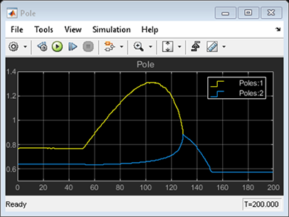 控制器性能根據(jù)設(shè)定值跟蹤和干擾抑制進行驗證。反應(yīng)器濃度CA設(shè)定點從原始的8.57(低轉(zhuǎn)化率)過渡到2(高轉(zhuǎn)化率)kmol/m^3。在過渡過程中,反應(yīng)器首先變得不穩(wěn)定,然后再次穩(wěn)定(見上側(cè)極點圖)。