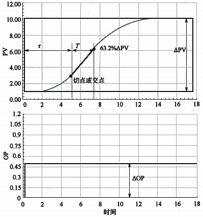 在初始穩態條件下做開環階躍測試。將PID控制器的輸出(OP)進行幅度為△OP的階躍改變并保持,過程變量(PV)將會發生改變并最終穩定變化。這種描述系統或過程中輸入與輸出關系的曲線稱為“過程響應曲線”。在許多領域,都使用響應曲線進行分析和優化過程的性能。