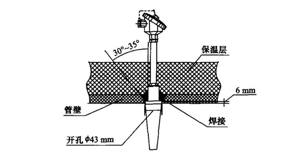 下圖為熱套式管座焊接方式,先在管道上開一個640mm的孔,然后在管道壁上焊一個8.9mm×23.5mm的管座,再將熱電偶插入管座內(nèi),將熱套式熱電偶套管與管座焊在一起。這種焊接方式適用于熱套式熱電偶,它對管座制作及熱電偶焊接過程要求非常嚴(yán)格,必須同時滿足下列條件: