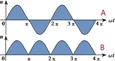對(duì)于交流,除了最大值與有效值,還有一個(gè)平均值,用的也比較多,而且與有效值容易發(fā)生“誤撞”。在一個(gè)周期內(nèi),數(shù)學(xué)上的平均值是0(正負(fù)半軸對(duì)稱(chēng)),但電工技術(shù)上,關(guān)心的是量值(絕對(duì)值),所以,對(duì)于交流電的平均值指的是交流電絕對(duì)值在一個(gè)周期內(nèi)的平均值。如此,得把負(fù)半軸給翻上去!