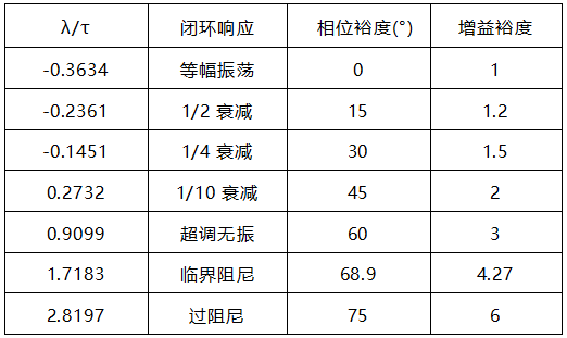 從更廣泛意義上看,選擇積分時間等于時間常數后,比例增益應該和時間常數成正比,和增益、純滯后成反比。想獲得不同的閉環性能可以選擇不同的系數。這樣可能的整定公式可以描述如下。其實a=2超調、a=3臨界阻尼,a=3無超調、a=4過阻尼這些都是理論值的近似。而且當a≥2時,(a-1)τ基本上是期望的閉環時間常數。如果a小于2則可以獲得有超調的過程。嚴格意義上的解析解和頻域的相位裕度相關,見下表。