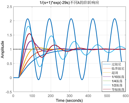 如果被控對象是一個τ/T=29/1的純滯后主導對象使用不同λ的閉環階躍響應見下圖。選擇不同λ可以實現從過阻尼到等幅振蕩的所有閉環響應。