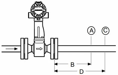 工藝管線的設計應保證渦街流量計本體始終充滿過程流體,渦街流量計本體的上游和下游側應有足夠長度的直管段,應把閥門安裝在渦街流量計的下游。