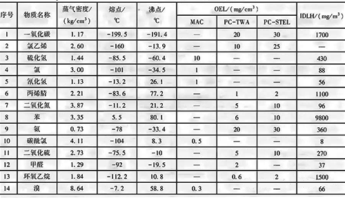 在現行國家標準《石油化工可燃氣體和有毒氣體檢測報警設計標準》GB/T50493-2019中,對甲類氣體和液化烴、甲B 、乙類可燃液體化后形成的可燃氣體或其中含有少量有毒氣體和一氧化碳、氯乙烯、硫化氫、氯氣、氰化氫、丙烯腈、二氧化氮、苯、氨、碳酰氯、二氧化硫、甲醛、環氧乙烷、溴(常用有毒氣體、蒸氣特性見下表)等的有毒氣體進行檢測報警。