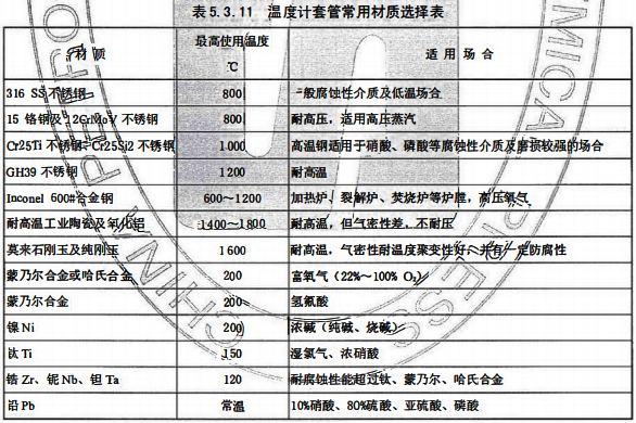 d)溫度計套管材質的選用應滿足溫度測量范圍及防腐蝕、防磨蝕等要求,最低應選用316SS并且不應低于設備或管道材質,設計可按表5.3.11選擇相應的材質: