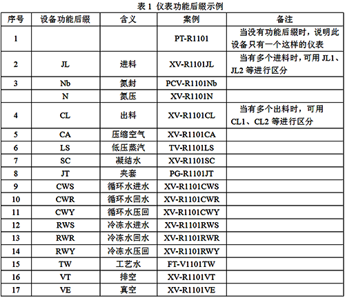 化工廠多由反應釜、儲罐、冷凝器、泵、接收罐等設備組成,根據HG/T 20559.5-1993《管道儀表流程圖物料代號和縮寫詞》,儀表位號功能后綴可根據精細化工的特點制定,參考表1所列,也可結合具體項目實際情況進行調整。