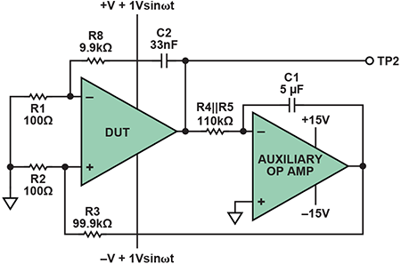 為了測量交流CMRR,利用幅度為1V峰值的交流電壓調制DUT的正負電源。兩個電源的調制同相,因此實際的電源電壓為穩定的直流電壓,但共模電壓是2V峰峰值的正弦波,導致DUT輸出包括一個在TP2測量的交流電壓。