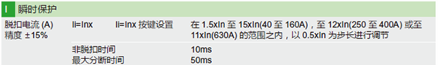 兩條斜曲線代表熱保護的最大動作時間(上)和最小動作時間(下),Ii=8In代表磁脫扣動作電流值,最右邊綠色區域代表能量脫扣,動作閾值25In,動作時間小于10ms。