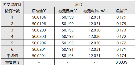 表1 溫度變送器在50℃重復測量6次的讀數