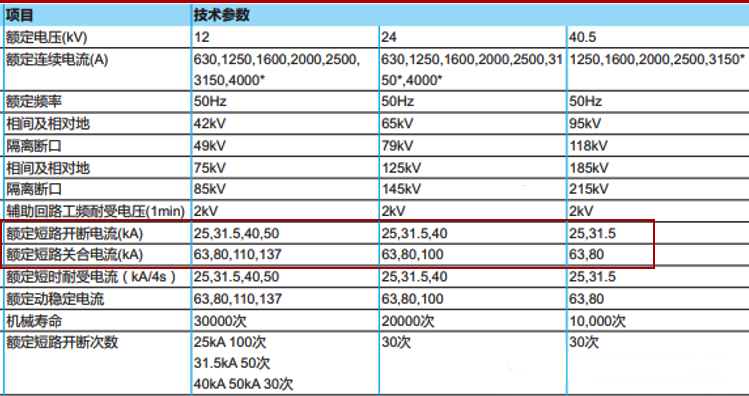 如下圖所示,為某知名品牌的真空斷路器部分技術(shù)參數(shù),圖中紅色框內(nèi)的額定短路關(guān)合電流與額定短路開斷電流之比為2.5,該比值對(duì)12kV、24kV、40.5kV均有效。