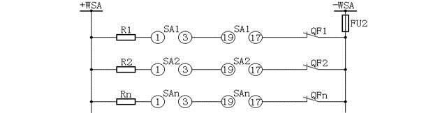 圖4中:+WC、-WC為控制母線;FU1、FU2為熔斷器,R1-10/6型,250V;SA為控制開關,LW2-1a.4.6a.40.20.20/F8型;HG為綠色信號燈具,XD2型,附2500Ω電阻;HR為紅色信號燈具,XD2型,附2500Ω電阻;KL為中間繼電器,DZB-115/220V型;KMC為接觸器; KOM為保護出口繼電器;QF為斷路器輔助開關;WCL為合閘小母線;WSA為事故跳閘小母線;WS為信號小母線;YT為斷路器跳閘線圈;YC為斷路器合閘線圈;FU1、FU2為熔斷器,RM10-60/25 250V;R1為附加電阻,ZG11-25型,1Ω;R2為附加電阻,ZG11-25型,1000Ω;(+)WTW為閃光小母線。