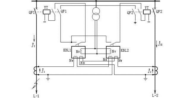 當(dāng)一回線路發(fā)生故障(如線路L-1的K點(diǎn)),由于II>I2,并由于電壓大大降低,電壓線圈的反作用力矩顯著減少,因此KBL1中由II產(chǎn)生的動作力矩Mw1大于I2產(chǎn)生的制動力矩MB1與電壓產(chǎn)生的制動力矩Mv之和,所以KBL1動作,切除故障線路L-1;對于KBL2,由于流過其制動線圈的電流II大于工作線圈流過電流I2,即制動力矩大于動作力矩,所以它不會動作。