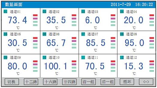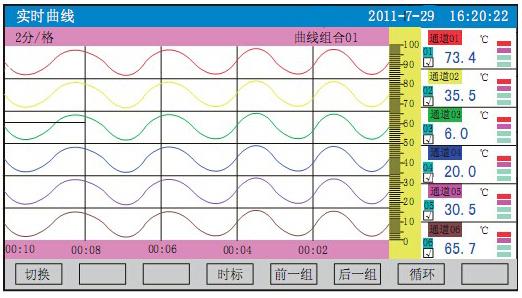 YR-ASR600型無紙記錄儀安裝在值班室內(nèi),無紙記錄儀的實時曲線畫面同時顯示六組數(shù)據(jù)值,數(shù)顯畫面能同時顯示十二組數(shù)據(jù)值,操作人員主要通過這兩種顯示方式監(jiān)測觀察生產(chǎn)線運行情況。如窯頭看火工根據(jù)無紙記錄儀顯示的溫度和自己多年積累的觀火經(jīng)驗,及時地調(diào)整窯的運轉(zhuǎn)狀態(tài);如水泥窯煙室溫度過高或者過低時無紙記錄儀會發(fā)出測量值報警提示和連鎖閃光報警器報警,操作人員就能及時調(diào)整噴煤機轉(zhuǎn)速去改變喂煤量的大小,保證生產(chǎn)出質(zhì)量好、產(chǎn)量高、消耗低的熟料。